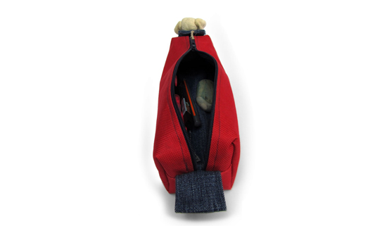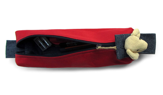 Duurzaam etui gemaakt van gerecycled materiaal: spijkerbroek, rugzak, zeem.