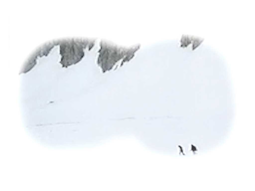 Twee mannen worstelen zich een weg door de sneeuw. Filmstill documentaire gebruikt in een workshop (Daltonschool) met als thema ‘doorzetten en niet opgeven’.